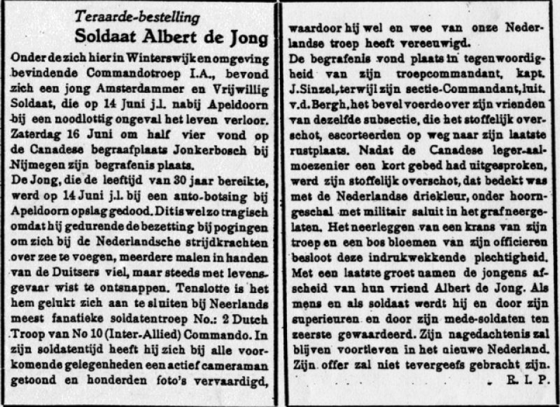 Deze pagina gaat over de enige Nederlander die ligt begraven op het Canadese kerkhof te Groesbeek. Per toeval kwam ik in contact met zijn zoon Guus de Jong. Guus is een veel gevraagd en een zeer gewaardeerd persfotograaf in Nederland en in het buitenland.Als enige zoon van oorlogsfotograaf Albert de Jong (omgekomen in 1945) trad deze Ras Amsterdammer in de voetsporen van zijn vader. Zo won Guus de Jong in 1968 de Gouden Aztekenmedaille (Mexico) voor zijn sublieme sportfoto's uit alle werelddelen, de eerste prijs Nieuwsseries/zilveren Camera voor zijn schokkende serie van de vermeende oorlogsmisdadiger Pieter Menten bij diens arrestatie in 1976 (Zwitserland); de Zilveren Camera in 1978 voor zijn arrestatiefoto's van de RAF-terroristen Wackernagel en Schneider (Amsterdam) en in 1983 de eerste prijs Documentaires/Zilveren Camera voor zijn opzienbarende reportage over Criminaliteit in Amsterdam. Als eerbetoon aan zijn vader heb ik deze website gemaakt van de man die als enige Nederlander ligt begraven op het Canadese ereveld te Groesbeek. Albert de Jong is op tragische wijze om het leven gekomen. Tijdens een tragisch auto ongeluk in Apeldoorn werd hij op 14 juni 1945 op slag gedood. Hij is slechts 30 jaar geworden. Albert de Jong heeft volgens Guus veel goeds gedaan voor Nederland tijdens de Tweede Wereldoorlog. Wilt u het verhaal nog eens horen van soldaat Albert de Jong dan kunt u mailen dan wel bellen naar dhr Guus de Jong. De adressen volgen hieronder.