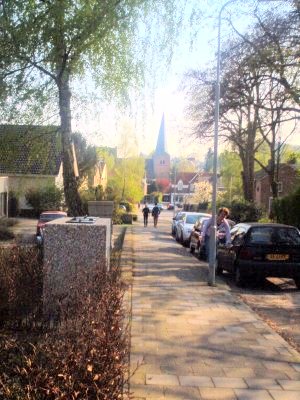 Uitzicht onderaan de Houtlaan, met op de achtergrond de torenspits van de protestantse kerk aan de Kerkstraat.