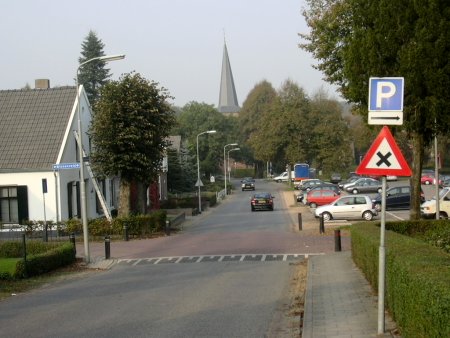 Hier ziet u de Houtlaan met op de achtergrond de protestantse hervormde kerk van Groesbeek, gelegen aan de Kerkstraat te Groesbeek. September/Oktober 2005