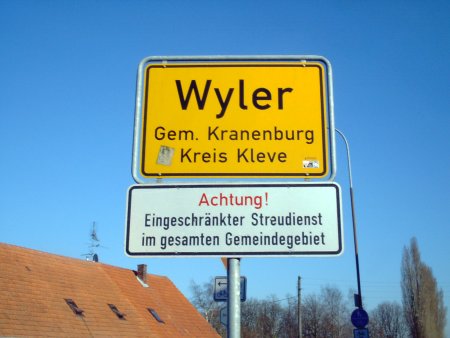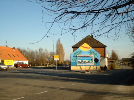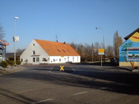 Op deze foto ziet u de voormalige grenspost Wyler, deze grenspost ligt ongeveer 2 a 3 km van Groesbeek. Waar het kruisje staat heeft jarenlang het huisje van deze voormalige grenspost gestaan, zoals u ziet is het nu een kale plek dat niets herinnert aan die vervlogen tijd. Klik op deze link om te zien hoe het op exact dezelfde locatie het er in 1955 toen uitzag. |