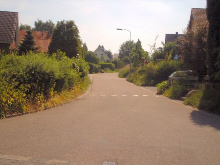 Op dit punt ziet u de Mooksestraat deze foto is genomen op de kruising Mooksestraat - Binnenveld, links van de foto is ook nog een gedeelte van de Mooksestraat dat uitmond in het centrum van Groesbeek rechts van de foto gaat u richting binnenveld - houtlaan en het Groesbeeks bos. |
