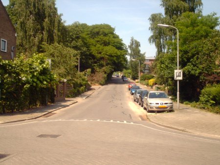 Deze foto is in de Ottenhofstraat in juni 2003 genomen u ziet hier het begin van de zevenheuvelenweg deze weg komt uit op de nieuwe weg, klik op deze link om te zien hoe het op bijna exact dezelfde locatie tussen de jaren 20 en 40 het er toen uitzag u zult zien dat de contrasten enorm zijn. |