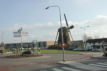 Hier kijkt u uit op de Zuid molen van Groesbeek, deze molen is momenteel in renovatie, verder ziet u vier wegen die hier samen komen te weten de Gooiseweg, Mookse baan, Pannenstraat, de laatste straat moet ik even onthouden, verder ziet u achter de Zuid molen het verzorgingstehuis de Meent, niet zichtbaar is er ook nog een supermarkt achter de molen. |