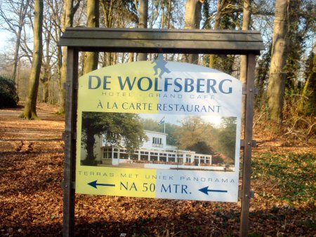 Uithangbord met als aankondiging Hotel - Grand Café a La Carte Restaurant De Wolfsberg. De foto dateert van eind maart 2005 Meer weten over dit chique hotel dat zeer in trek is bij toeristen klik dan op deze link voor meer info hierover. |