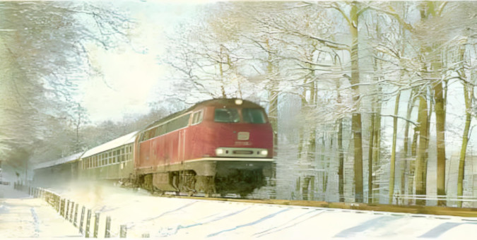 Een dieselloc van de serie 215 stuift door een prachtig kerstlandschap. Groesbeek 28 december1976.