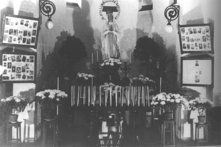 vier lijsten met foto's, bijeengeteld ongeveer 70 parochianen.