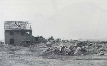 | Links de zwaar beschadigde pastorie en rechts daarvan alles wat er over bleef van de kerk. Pastoor van der Leeden woonde in een primitief opgelapt kamertje van het verwoeste klooster, maar was meestal afwezig vanwege zijn fameuze bedeltochten en preken door het hele land. Een pater deed 's-zondags de H. Mis in de ook al erg primitief herstelde kapel van het voormalige klooster. Met het bijengebedelde geld kon in 1948/1949 de noodkerk gebouwd worden (later parochiehuis). Naar een ontwerp van architect Van der Laan werd de nieuwe kerk gebouwd., die in 1953 kon worden ingewijd, compleet met klokken, voor pastoor Van der Leeden zo trots op was. |