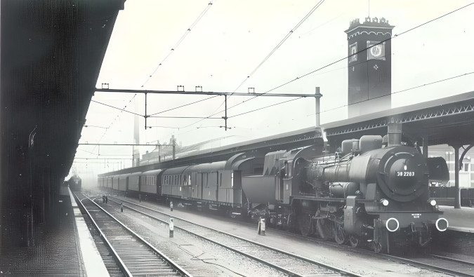 Locomotief 38 2263 met trein Dm 80669 (tien rijtuigen) bij aankomst uit Arnhem te Nijmegen, 12 december 1957.