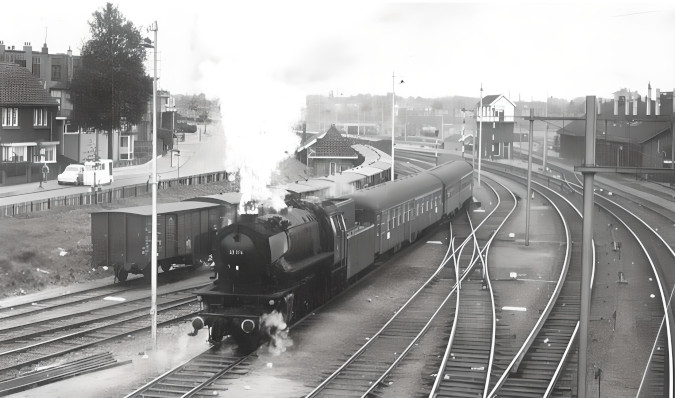 | Voor de niet in de richting Arnhem doorgaande treinen uit Kleef was het kopspoor aan de oostzijde van het eerste perron in Nijmegen de stek. Na aankomst moest dan voor omlopen worden teruggezet. Hier duwt DB-locomotief 23 079 haar trein 293 uit Keulen het Nijmeegse station uit. Nijmegen, 18 mei 1959. |