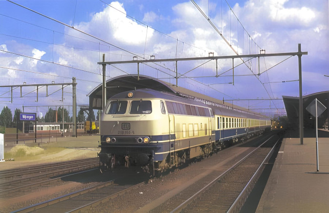 DB-dieselloc 218 153 met trein D 417 (Amsterdam - Keulen) gereed voor vertrek te Nijmegen, 21 mei 1988.