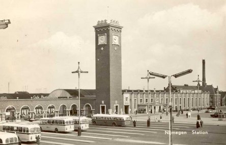 Hier ziet u het prachtige station Nijmegen, deze prent dateert ergens uit de jaren vijftig zo op het eerste gezicht te zien.