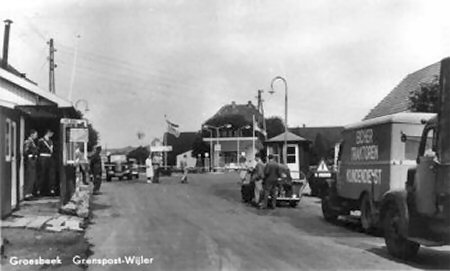 Grenspost Wyler - Groesbeek Op deze nostalgische foto ziet u de grenspost Wyler - Groesbeek. Deze foto is genomen op 9 augustus 1955. Klik op deze link om te zien hoe op exact de zelfde plek het er tegenwoordig nu uitziet. Deze foto is afkomstig uit archief van Tonnie Weijers. |
