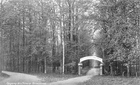 Ingang bosschen van de Wolfsberg', 1930 De ('op-') Rijlaan naar zijn hotel markeerde de hotelier Kraft met een toegangspoort. Duidelijk zal zijn dat er toen nog geen vrachtwagens over deze weg reden. Alleen rijtuigen en luxe auto's reden onder de boog door, het 'Hotel-Pension-Café-Restaurant' wordt vermeld. Toen er enige jaren later wel meer vrachtwagens op de weg kwamen gebeurde het, dat te hoog geladen vracht de boog beschadigde. De boog werd geheel vernield tijdens de Duitse inval in 1940. Links van de boog begint de Mooksebaan, het wegenpatroon op de voorgrond laat zien dat ook deze in die tijd nog niet zó intensief werd bereden. Foto en Tekst zijn afkomstig uit één van de boeken van G.G., Driessen |