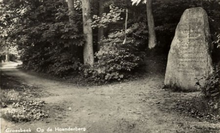 De Hooge Hoenderberg Bovenstaande prent dateert uit de jaren vijftig. De steen die u op deze plaats ziet staan is in 1963 verplaatst naar de ingang van asielzoekerscentrum Cantecleer. De prent is gemaakt nabij het spoorbruggetje. Onder dit bruggetje dat u op deze prent niet ziet staan ligt de spoorlijn Kleef - Nijmegen Wilt u meer over de geschiedenis weten over de Hooge Hoenderberg dan kunt u het beste op deze link klikken. |