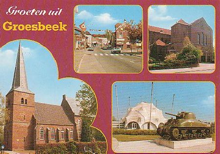 Groeten uit Groesbeek Bovenstaande ansichtkaart dateert waarschijnlijk uit de jaren tachtig. Bovenaan ziet u van links naar rechts het centrum van Groesbeek en de parochiekerk Cosmos Danianus. Onder ziet u van links naar rechts de Protestantse hervormde kerk en het Nationaal Bevrijdingsmuseum 1944-1945 Na een grondige verbouwing van het het Nationaal Bevrijdingsmuseum 1944-1945 heet het museum voortaan Vrijheidsmuseum het nieuwe museum is in september 2019 in gebruik genomen. |