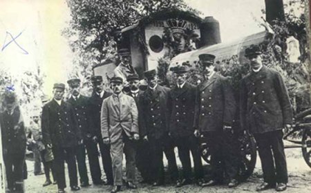 Spoorwegpersoneel van Groesbeek In het jaar 1923 was het groot feest in ons land, want koningin Wilhelmina vierde haar vijfentwintigjarig regeringsjubileum. Ook Groesbeek vierde op grootste wijze mee, door een grote en mooie optocht te organiseren, waar alle plaatselijke verenigingen aan deelnamen. Het spoorwegpersoneel ter plaatse bleef niet achter en bouwde een praalwagen in de vorm van een locomotief. Wij zien op de foto de trotse makers bij hun werkstuk. Van links naar rechts: Jan Hopman, de kleine jongen is Wim Nillessen (Binnenveld), dan Antoon Gerrits, Dirk van Neerbos, Piet Peters, Gerrit van Brienen, Brouwer, Mathijs Bögels, Verkuijlen, Jan Gietman en Herman Thijssen. Boven in de locomotief Jan Geurts; de man onder hem is onbekend. De Bron van deze schitterende foto opname is afkomstig van het Boekje: Kent u ze nog... de Groesbekers. |