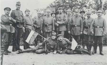 Door zijn ligging in het grensgebied heeft Groesbeek eeuwenlang te doen gehad met soldaten en grensbewakers. Tijdens de eerste wereldoorlog en de daarmee gepaard gaande mobilisatietijd bleef het echter bij oorlogsdreiging. Uit deze periode zijn verscheidende foto's met soldaten voorhanden en uit al die foto's blijkt, dat de Duitse en Nederlandse grensbewakers het goed met elkaar konden vinden. Deze foto is tevens interessant, omdat achter de groep een bord staat, waarop vermeld wordt dat 'venten' verboden is. Waarschijnlijk is dit nog een waarschuwing, gericht tot de Groesbeekse 'Hausierders', die vroeger de grens overtrokken om in Duitsland hun koopwaar aan de man te brengen. |