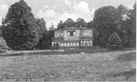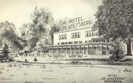 Landhuis 'De Wolfsberg omstreeks 1920 Landhuis 'De Wolfsberg' komt op 13 juli 1930 in bezit van de familie J.W. Kraft - Punessen die het verbouwde tot een hotel - restaurant. Waarschijnlijk is dat Kraft, geboren in Rotterdam en later in Amsterdam werkzaam als inspecteur RVS, door zijn ouders opmerkzaam is gemaakt dat het landhuis te huur of te koop stond. (zijn ouders beheerden Pension Hoornwijk aan het Binnenveld). Kraft was gehuwd met de in Krefeld geboren Henriette Punessen, die borg gestaan zal hebben voor een degelijke verzorgende huishouding en keuken. Vermeldenswaardig is dat Kraft het 'herenhuis' huurde van de 'Vereniging tot Behoud van Natuurmonumenten in Nederland' voor een bedrag van f 1600, - per jaar. Verder dat de minister va Arbeid, Handel en Nijverheid op 24 november 1930 de 'logementvergunning' verleent. Tijdens de periode 1944-45 wordt het pand behoorlijk beschadigd maar kon worden hersteld. In de jaren vijftig komt komt zoon Jan, die inmiddels het koksvak geleerd heeft, zijn ouders helpen. De zaak bloeit en groeit zodat in 1957 een vleugel aan het hotel wordt gebouwd. Enige jaren later neemt het echtpaar J. Kraft-Pruisen de zaak over waarna in de jaren zestig nog een kleinere nieuwbouw, en modernisering, plaats vindt. In 1990 geven Jan Kraft en Joke de Haan de zaak over aan Els Kraft en haar partner, die het oude en rustieke hotel meer toegankelijk maken voor 'komende en gaande' bezoekers. Na tien enerverende jaren, van goede en slechte tijden, wordt besloten tot verkoop. Op 11 september 1999 meld De Gelderlander dat De wolfsberg overgaat in andere handen. De nieuwe eigenaren zijn Erik Peters uit Groenlo, Ben Wijnhoven uit Groesbeek en Mark en Luc van der Feer afkomstig uit Lelystad. De dagelijkse leiding zal in handen komen van een bedrijfsleider. Het pand zal een intensieve verbouwing ondergaan die begin volgend jaar (was 2000) van start zal gaan, waarbij binnen een en ander zal veranderen. De nieuwe eigenaars willen daarmee een bijdrage leveren aan het toerisme in Groesbeek en uitgaansleven in de regio. |