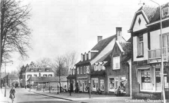 Een eerste, grote verandering onderging de Dorpsstraat toen in 1978 door de N.S 'Blokpost T' werd gesloopt. Vanaf die tijd werd de beveiliging van de spoorwegovergang overgelaten aan automatisch gestuurde 'ahob's en 'aki's. Door de sloop van de blokpost kon echter wel een overzichtelijke bocht in de straat worden aangelegd. Waar eens een spoorwegman de slagbomen bediende, rijden nu auto's. Nadat op 1 juni 1991 de laatste trein Groesbeek passeerde konden de 'ahob's en 'aki's buitenwerking worden gesteld. Deze veroorzaakten regelmatig, in nachtelijke uren, veel geluidsoverlast als zij door baldadige jongeren in bedrijf werden gesteld. Het lawaai van rinkelende bellen werd nog versterkt door de luid en lang claxonnerende automobilisten en het draaien en keren van auto's die het wachten op de storingsdienst van de N.S. beu waren. Maar ook voor de daar logerende hotelgasten was het een ramp; zeker als hen, bij navraag, was verzekerd dat de laatste trein om 21.00 uur zou passeren en dat het verder rustig was. Niet zichtbaar op deze foto is het links staande gemeentehuis; dat zou in de zomer van 1996 opgetuigd worden met lichtreclames en reclamevlaggen. Niet door de gemeente maar door de nieuwe eigenaars die daar een Bruna, een Marskramer en een Modehoek in openden. Naast het gemeentehuis stond het huis van de fietsenmaker Thé. Hock. In 1965 is het oude pand door de familie S. van Bergen-Hock verkocht aan de gemeente Groesbeek die het sloopte en daar in 1975 een raadszaal bouwde, nu staat daar de winkel van de Marskramer. De familie Sjef van Bergen opende einde 1965 aan de overzijde van de straat een nieuw zakenpand, garage en fietsenhandel, dat eind 1983 gedeeltelijk verhuurd werd als EDAH supermarkt en nu bekend staat als 'Blokker' winkel. Wilt u zien hoe de dorpsstraat van Groesbeek er in februari 2003 eruit ziet op ongeveer de zelfde locatie? klik dan op deze link om de vergelijking te bekijken. Foto en tekst zijn afkomstig uit één van de boeken van G.G. Driessen |