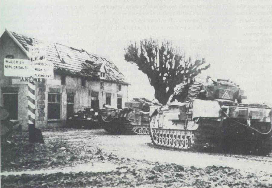 Molenweg Om de een of andere gelukkige reden is het café 'De Oude Molen' niet volledig van zijn hoge plaats afgeschoten. Daardoor kon het toch wel beschadigde café onderdak bieden aan manschappen van de op de foto afgebeelde Britse Churchill-tanks. Een passerende Britse legerfotograaf maakte eind februari 1945 deze treffende oorlogsfoto. De tanks zouden een paar dagen later worden ingezet bij de operatie Veritable. |