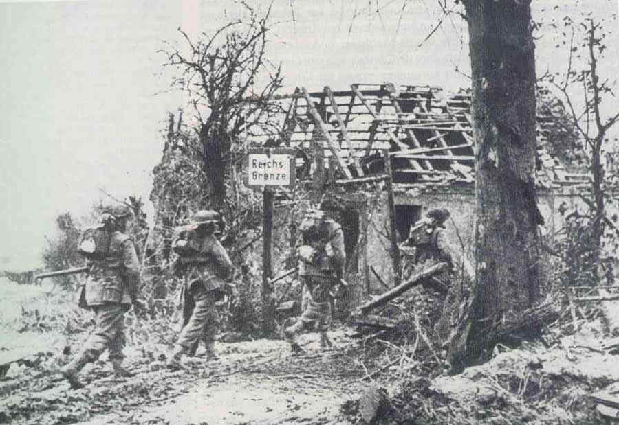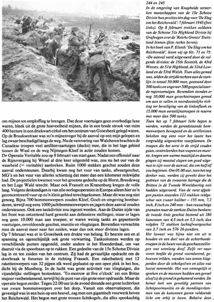 Op 8 februari 1945 trokken soldaten van de Schotse 51e Highland Divisie bij Grafwegen over de 'Reichsgrenze' Duitsland binnen. Operatie 'Veritable' ging van start vanaf de frontlijn Mook-Groesbeek-Ooij. Dit na een inleidend bombardement uit 1000 geschutsmonden. Intussen waren de plaatsen Kleef en Goch gebombardeerd door vliegtuigen, die deze plaatsen en hun omgeving veranderden in grote puinhopen. Wegens verbitterde Duitse tegenstand en slechte weersomstandigheden werd de operatie een uitputtingsslag die ruim een maand zou voortduren. Als de operatie 'Veritable' op 10 maart afgesloten wordt (het geallieerde leger staat dan voor de Rijn) zijn er 15.600 Briten en Canadezen gesneuveld. |