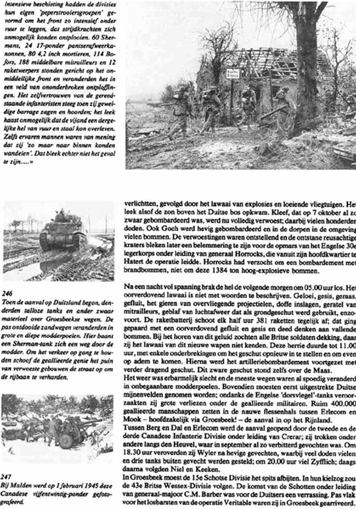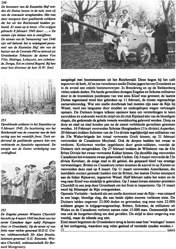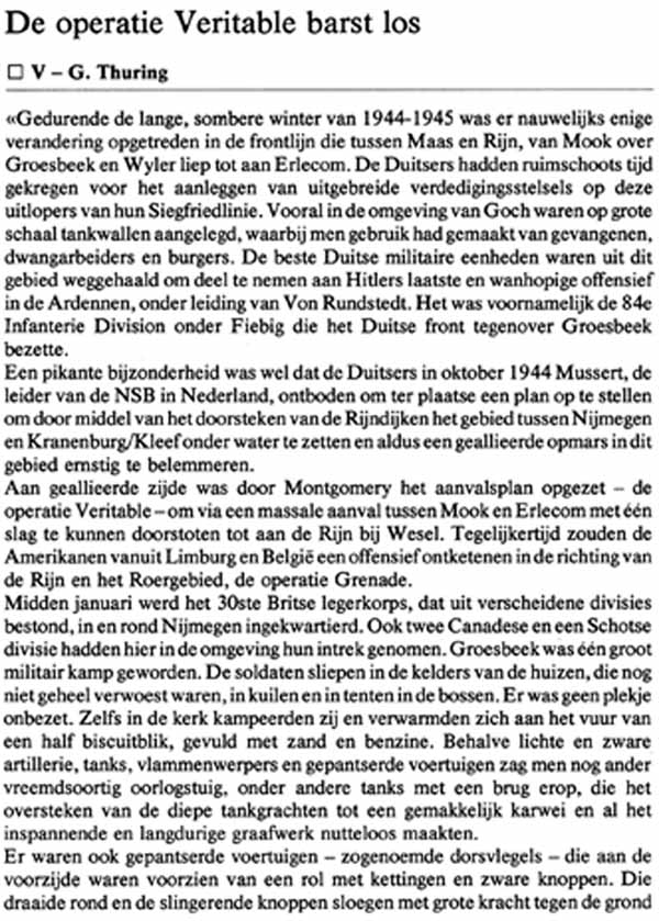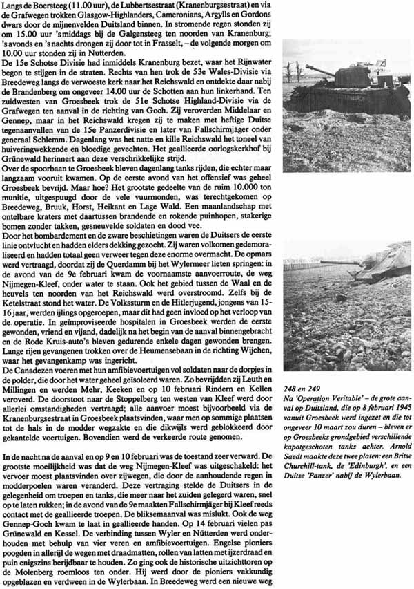 Het grote offensief (De Gelderlander, 6 februari 1946) Herinneringen aan den strijd bij Groesbeek De sneeuw en koude der Januari-maand zijn verdwenen; - laag nevelen zich de wolken over de dorpjes en de grijze keizerstad aan de Waal, waar nog de majestueuze brugoverspanning trots wijst op den triomph van de jeugdigen heldenmoed. Over de wegen raast een massaal verkeer. Tanks, trucks, amphibiebooten en een enkele jeep daar tusschendoor, rijen zich tot een lange karavaan, zonder een begin en einde, naar 't schijnt! 't Is 8 Februari 1945 en we vertoeven aan den rand van Nijmegen. Geallieerden soldaten agiteeren druk, ze staan gevechtsklaar in den vroegen morgen. De vorige avond heeft de luchtmacht een offensief ingezet en Cleve en Goch gebombardeerd. Nog op deze prillen voorjaarsmorgen kunnen we de vlammen van de brandende stad Cleve zien oplaaien in een fellen gloed! Deze morgen 8 Februari 1945! Wel grootscheeps is het offensief ingezet op de Duitsche linies in het fameuze Reichswald te Groesbeek. Vanaf vroeg in den morgen beuken de kannonnen met moorddadig geweld op de vijandelijke linies. Het geschut, dat opgesteld is aan den rand van Nijmegen, langs de Groesbbksche bosschen en in het gebied rond Mook, verplettert in een alles-omvattende vernietiging het tot een aanval bereide Duitsche leger in den sector Cranenburg. De gehele grensstreek in vlammen. Langs de geheele grensstreek brandt het en ook het dorp Groesbeek hult zich in een walmenden gloed van in brandgeschoten boerderijen en den kruitdamp der afgevuurde projectielen, die als 't ware meter voor meter den weg banen voor den uiteindelijken stoot naar 't hart van Nazi Duitsland. Groesbeek betaalt zijn cijns aan den oorlogsmoloch! Na totale plundering van het bezit der bevolking tijdens de overwintering, worden thans huizen, boerderijen, kerken en scholen met de grond gelijk gemaakt. En de bewoners van dit bloeiende, natuurschoonrijke dorp, zwerven in wijde, onbekende verten. Aan de Fransch-Belgische grens kunt gij ze vinden, maar ook in Groningen en Friesland, in Amsterdam en Haarlem, zoo goed als in Thüringen en Westfalen. Voor hen is dit vooral een lange, bange winter van veel leed, honger en dood. Maar ook de stad Nijmegen lijdt vreeslijk onder de verderf zaaiende granaten van Duitschen kant, die veel inwoners hebben gedood en verwond. Op het oogenblik staat in Groesbeek nog een buitgemaakt kanon en daarop lezen wij: 'Tot zwijgen gebracht op 8 Februari 1945'. Dit geschut zaaide dood en verder van September 1944 tot Februari 1945'. Met vandaag is dit tijdperk gelukkig ten einde en worden de menschen verlost van het rustelooze gejaag en de vluchten naar elders. De voorbereidingen Voor het groote offensief, dat vanuit Groesbeek zou beginnen, waren reeds in het begin Januari 1945 voorbereidingen waargenomen, die een spoedig hervatten der krijgsoperaties in deze buurt deden verwachten. Tot deze voorbereidingen behoorden o.a. het aanleggen van nieuwe wegen, dwars door de bosschen heen. Deze dienden echter slechts als camouflage en zijn dan ook niet als verkeersobject gebruikt. Ook werd door de 'Royal Artillery' de geschutsopstelling berekend. De bediening der kannonen geschiedde door de manschappen van het 8ste leger, dat we reeds kenden van de roemrijke veldtochten in Lybië, Sicilië, Italië en Zuid-Frankrijk. Den soldaten was ontzegd eenig kenteeken te dragen in verband met de geheimhouding hunner aanwezigheid. In het dorp werd 't steeds drukker. Soldaten legerden zich in de huizen, die als zoodanig nog bruikbaar waren en ook in de bosschen was het vol met militairen. In de eertijds verlaten dorpsstraten was het een druk beweeg van menschen in uniform. Op iedere weg, in iedere straat, zelfs op elk paadje stonden trucks, tanks en jeeps opgesteld en in de tuintjes voor de huizen had men de munitiekisten hoog opgestapeld. 1200 Kannonen worden gericht Op 7 februari in den namiddag werden de voertuigen voorzien van roode doeken (kenteeken voor de vliegtuigen). De vuurmonden van ruim 1200 kanonnen werden nagezien, gericht en de munitiekisten gereed gezet. Omstreeks half tien in den avond naderden vliegtuigen en hun hevig gebrom bewees, dat ze op geringe hoogte vlogen en groot in aantal waren (700). Even voorbij Groesbeek lieten ze hun bommenlast vallen als een doodsregen op de Duitsche grensstadjes Goch en Cleve. Die nacht konden deNBS-ers niet slapen van spanning! En om vijf uur barstten ineens honderden en honderden kannonen los en wierpen duizenden granaten op en over de Duitse linies. In de grijze morgenschemering waren de inslagen soms duidelijk te zien. Na enige tijd was echter alles in een dichte rookwolk gehuld. Onafgebroken duurde dit enorme bombardement voort tot 11 uur toe. Toen zetten de machtige tankcolonnes zich in beweging en trok de infanterie op. Een schouwspel om nooit meer te vergeten! Langs tien wegen rukten zij op, o.a. langs de spoorbaan. Ook vlammenwerpers traden spoedig in actie. Al gauw brak in het Reichswald brand uit. De rossige gloed drong door de rookwolken heen. Wyler en Cranenburg waren al spoedig veroverd... Toen begon het water te stijgen. Het kwam tenslotte zo hoog, dat zelfs een gedeelte van de Parochie De Horst onder water stond. Krijgsgevangenen werden intussen in lange rijen aangevoerd. Ze zagen er ontzettend uit. Sommige liepen op een schoen en een klomp, geheel gedemoraliseerd, met vuile, verbrande gezichten. De meesten waren uitgeput, maar blij, omdat voor hen de oorlog voorbij was! Groesbeek was dus eindelijk en ten laatste echt vrij! Was de afgelopen winter menig Groesbeker al eens stiekem komen kijken, - waardoor hij vaak als spion was opgepikt!- nu werd de toevloed steeds groter. Steeds meer verhalen kwamen er onder de geëvacueerden in omloop over de geweldige verwoestingen en over de droeve plunderingen... Tenslotte waren zij niet meer te houden. De autoriteiten trachtten hen nog tegen te houden door te wijzen op de vele mijnen en boobytraps, doch de Groesbekers wilden naar huis... en ginge